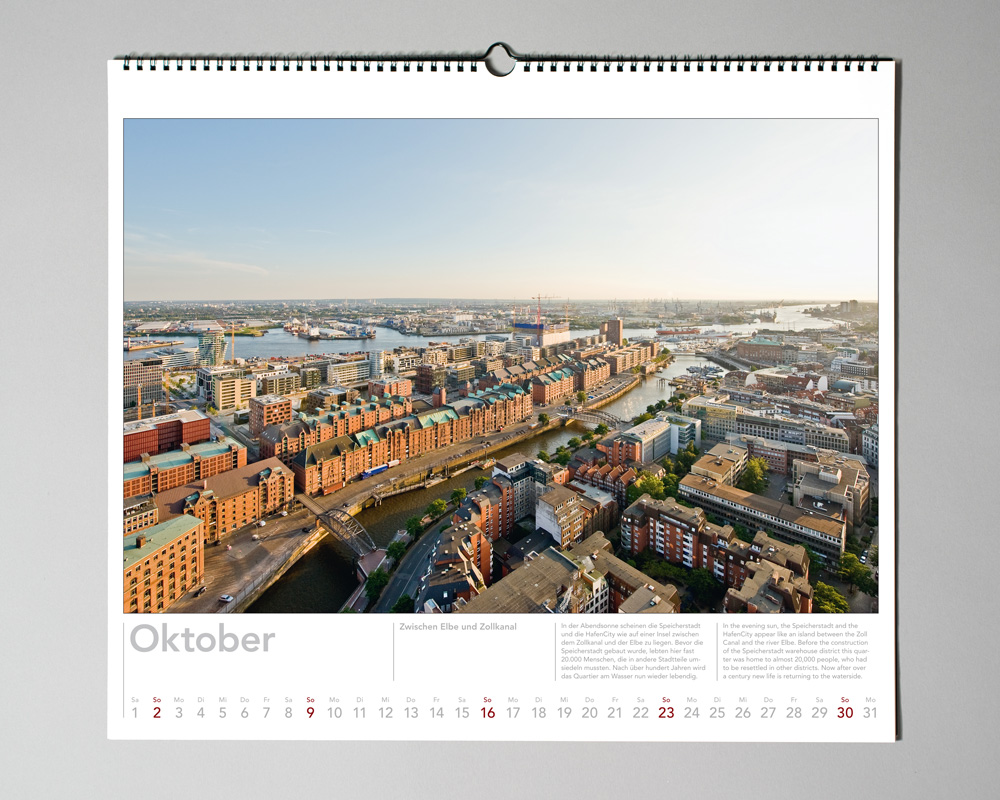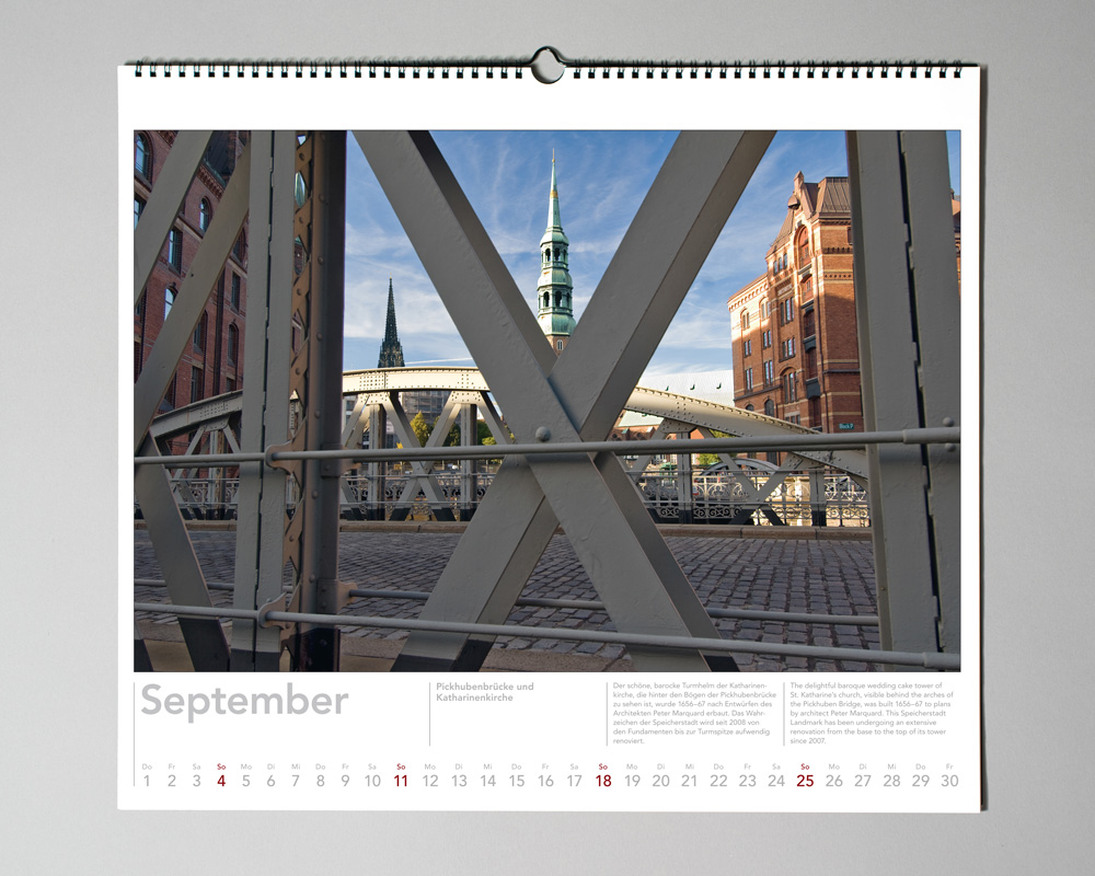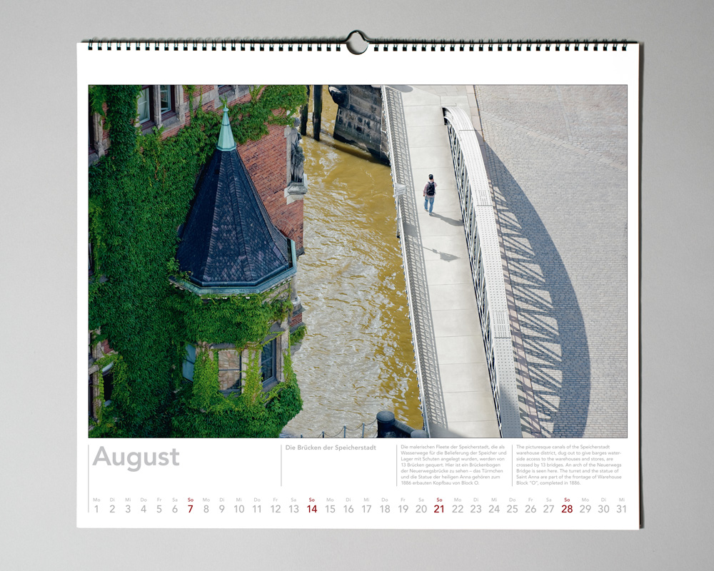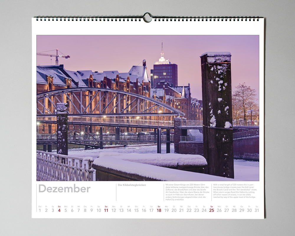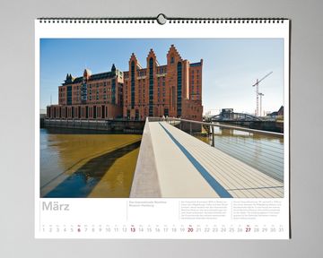 In Zusammenarbeit mit dem Nautik Historie Verlag. Zwölf jahreszeitliche Speicherstadt- und HafenCity-Motive, 50x44 cm, auf Wunsch in kundenspezifischer Ausführung